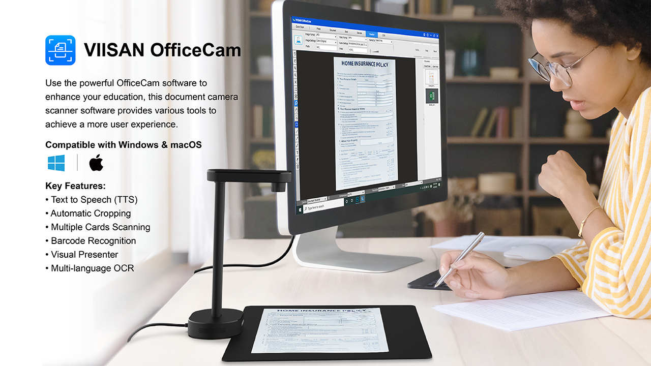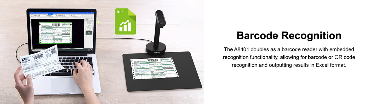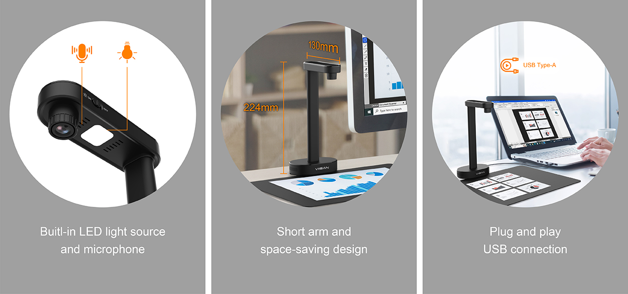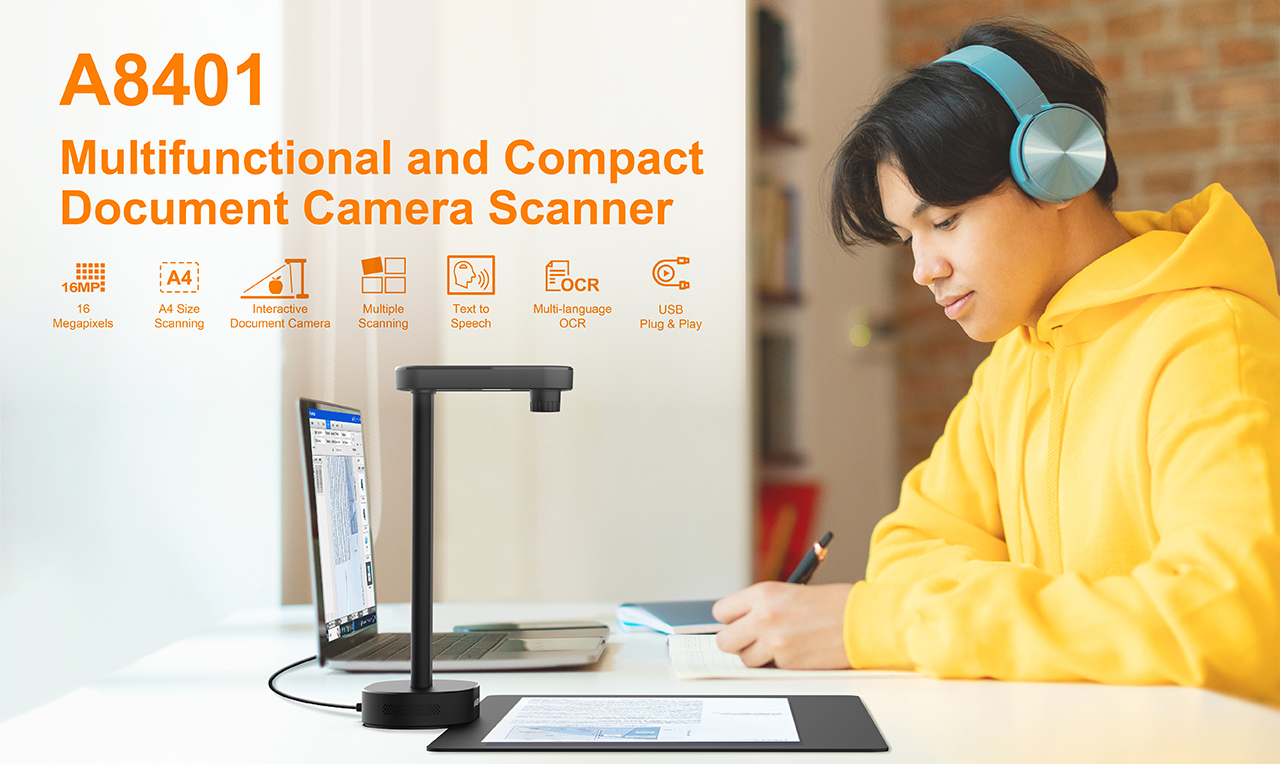 The A8401 is a compact document camera scanner with a short camera arm design. Streamlined to include only essential functionality, it features a 16MP ultra-high resolution camera, an interactive document camera function, and comes with efficient OfficeCam software. The multiple scanning tools include desktop cropping and deskewing technology, barcode recognition, multi-language OCR, and text-to-speech function. Scan documents up to A4 size and convert the contents into searchable PDFs and editable Word, Excel, and Text formats.