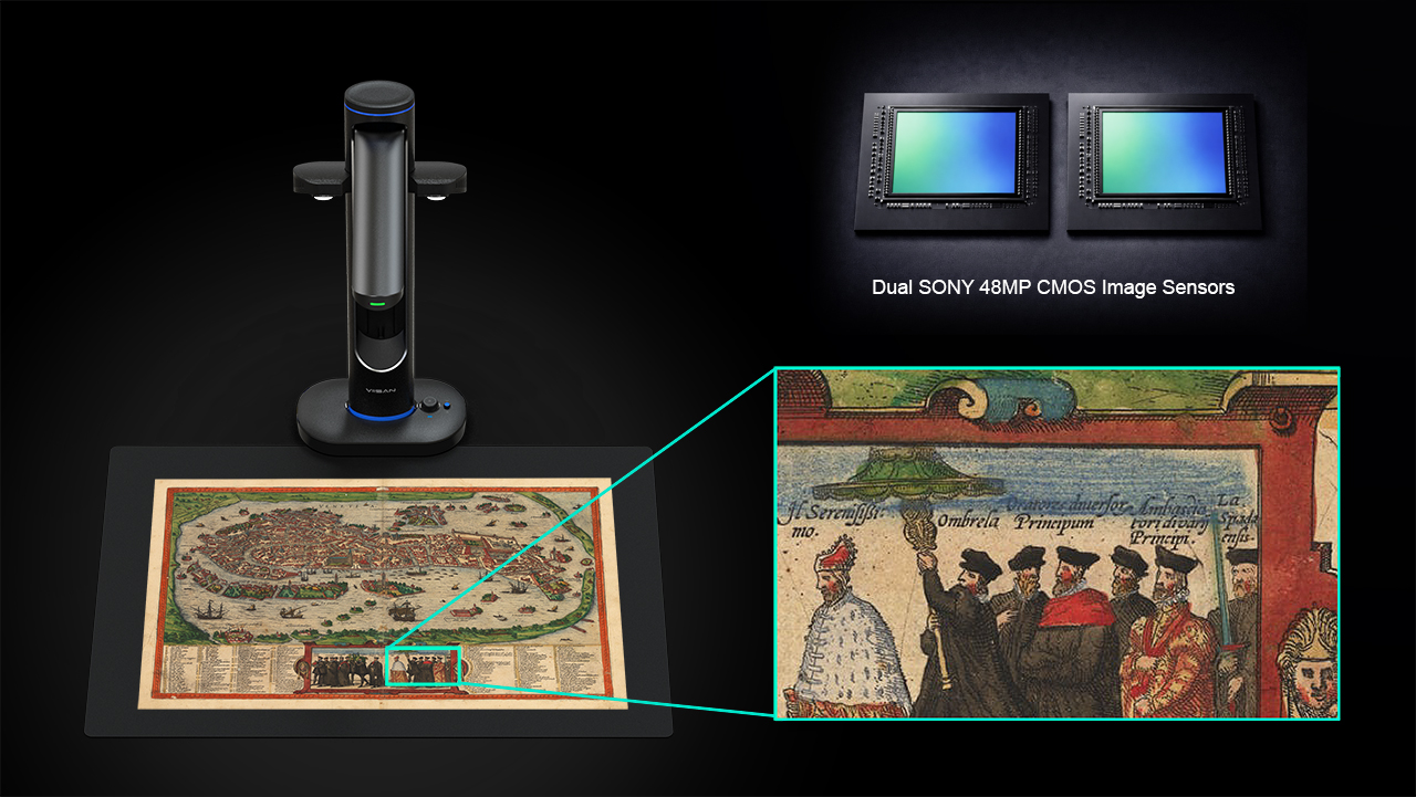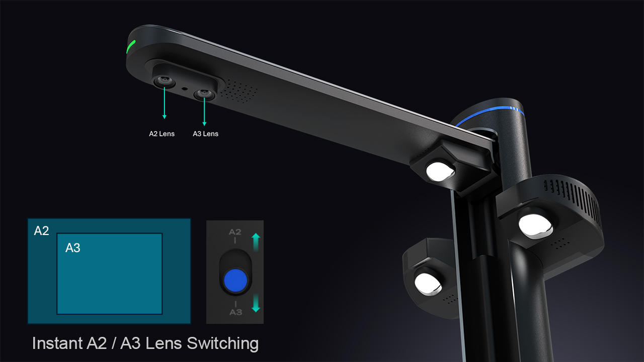 One lens is optimized for a wide A2 view angle, while the other focuses precisely on A3-sized documents, ensuring the perfect balance of coverage and clarity.