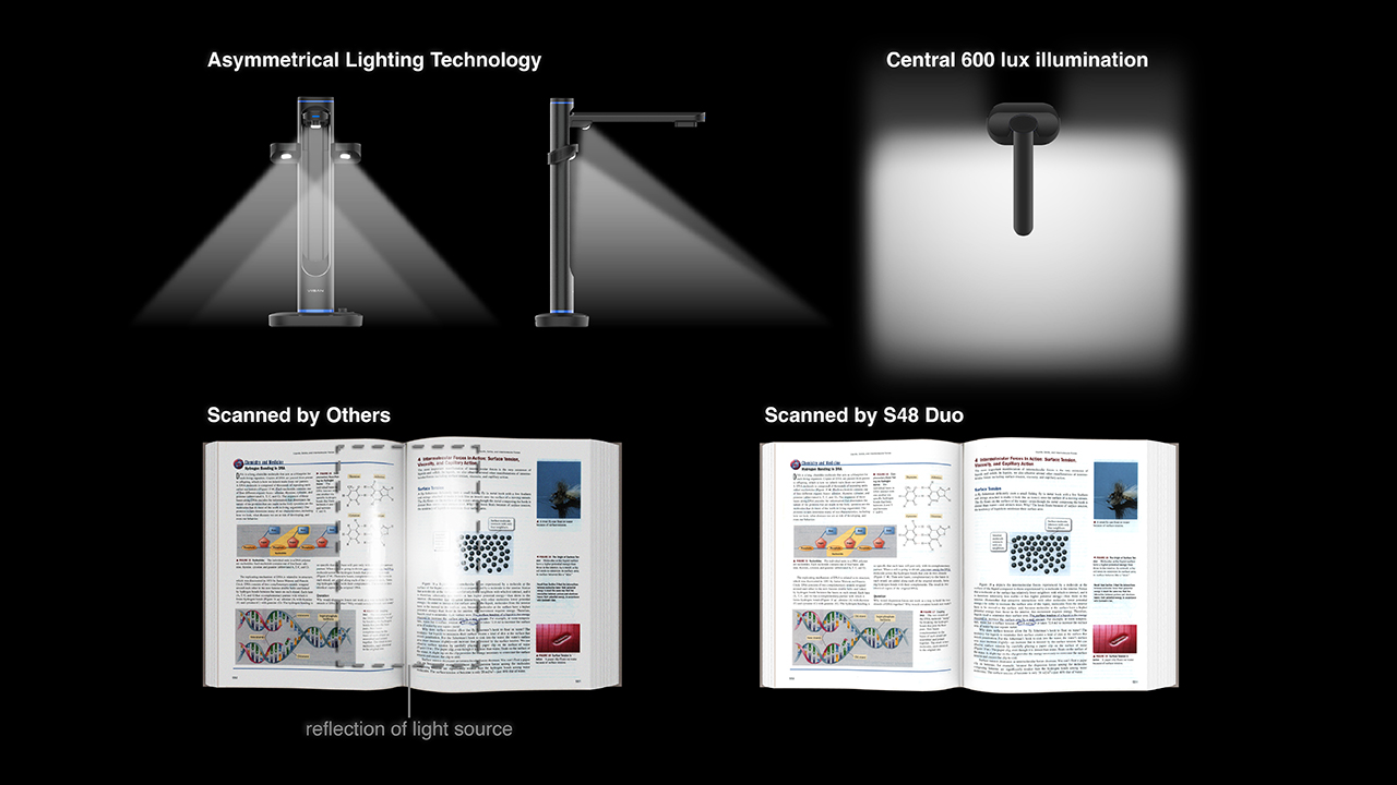 A convenient brightness knob lets you easily adjust the light intensity to match your environment. With advanced asymmetrical lighting technology, reflections on glossy or laminated pages are greatly reduced, ensuring every scan stays sharp, clear, and true to life.