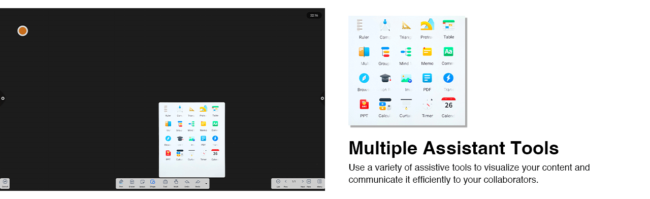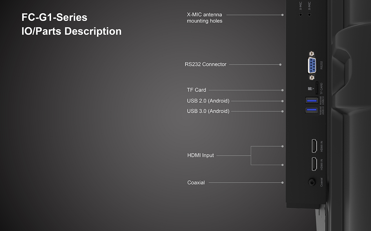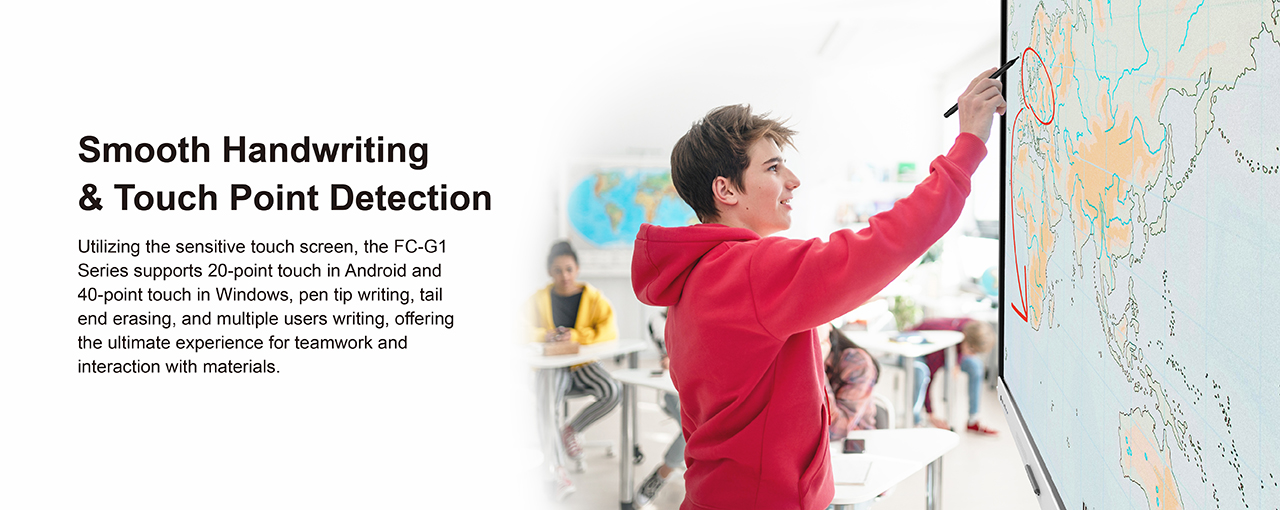 The FC-G1 Series is an all-in-one Interactive Flat-Panel designed for various teaching situations. This smart Interactive Flat-Panel comes with the powerful ViiShow visualizer app, compatible with optional wall-mounted and WiFi visualizers supporting both Android and Windows platforms. With this robust visualizer software, educators can directly add annotations, draw on the screen, take snapshots, and record videos to enhance the classroom experience for students.