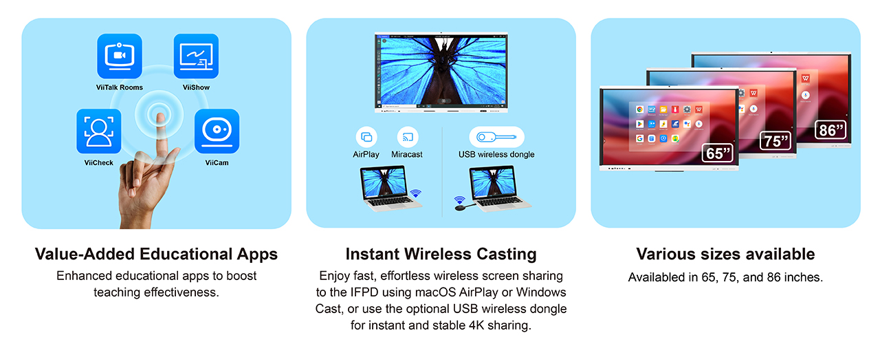 The panel can be paired with optional wireless solutions and a variety of wall-mounted visualizers, and it works with the exclusive ViiShow Visualizer software for live demonstrations and streaming. Powered by Android 14, the FC-G1 Series is available in 65-, 75-, and 86-inch models, with flexible configuration options to meet diverse classroom and collaboration needs.