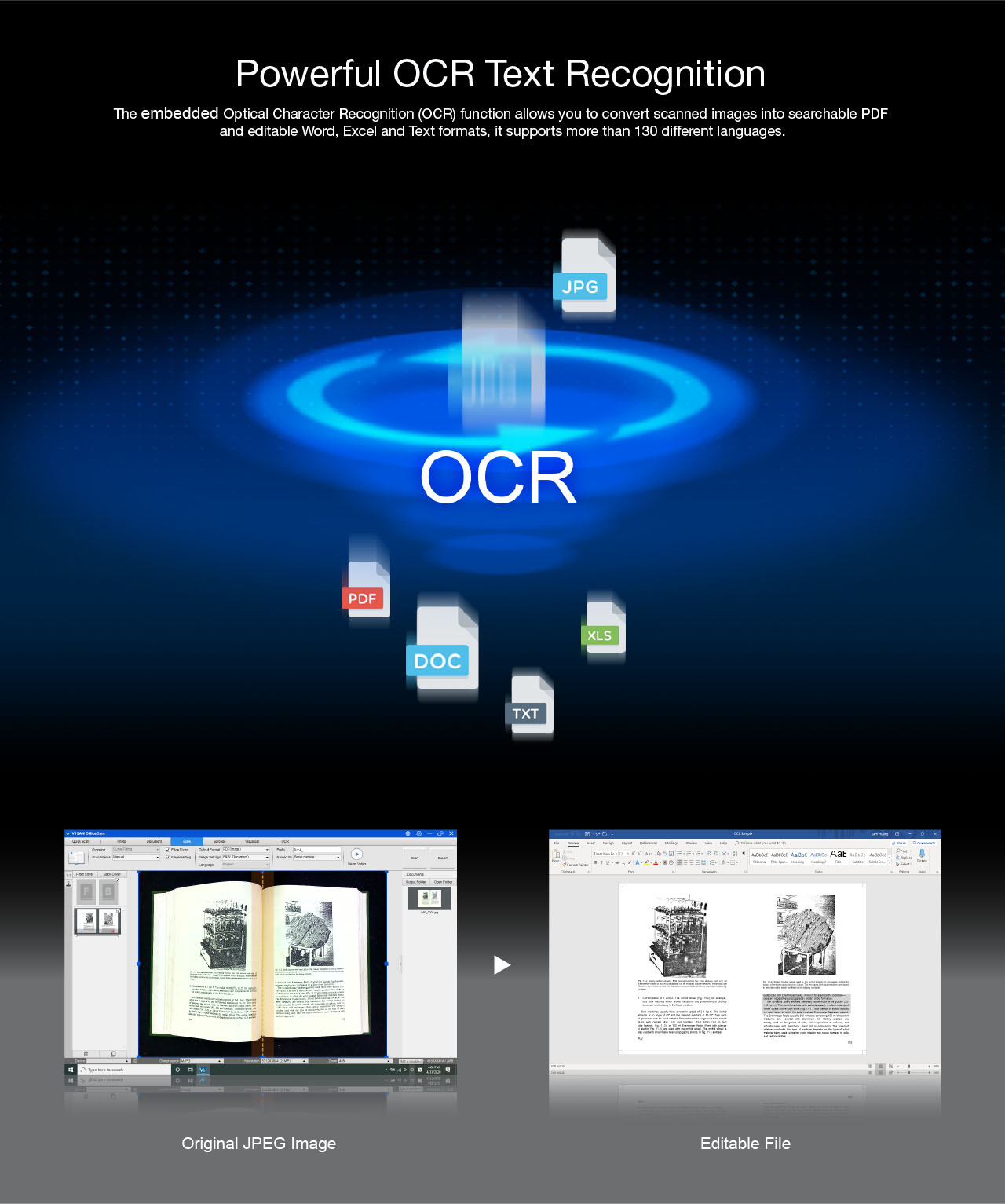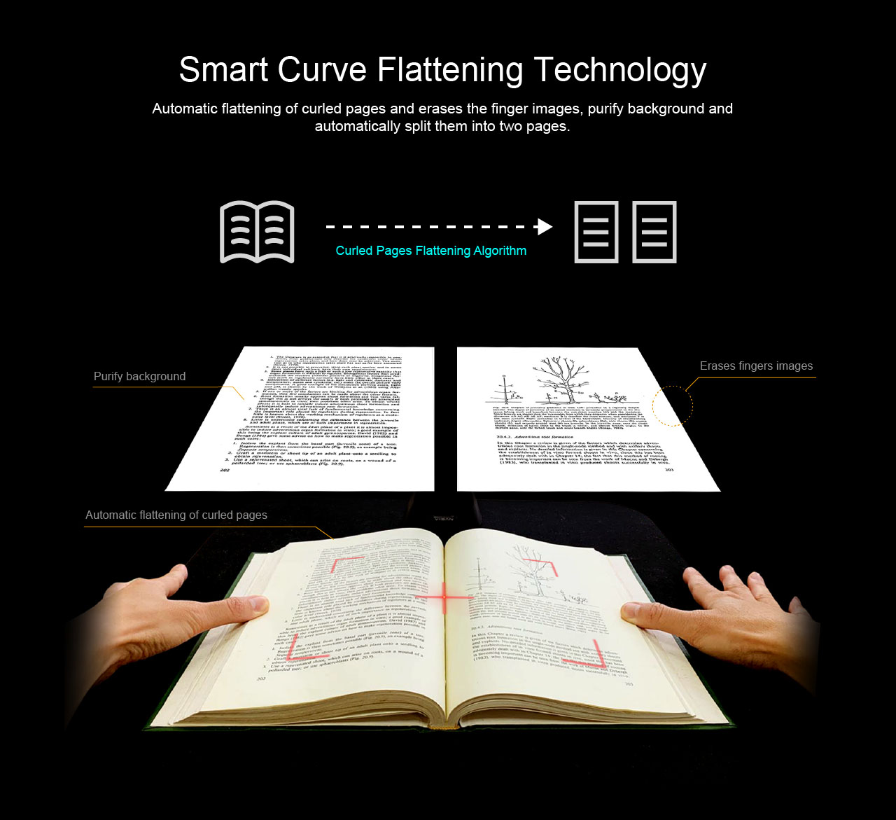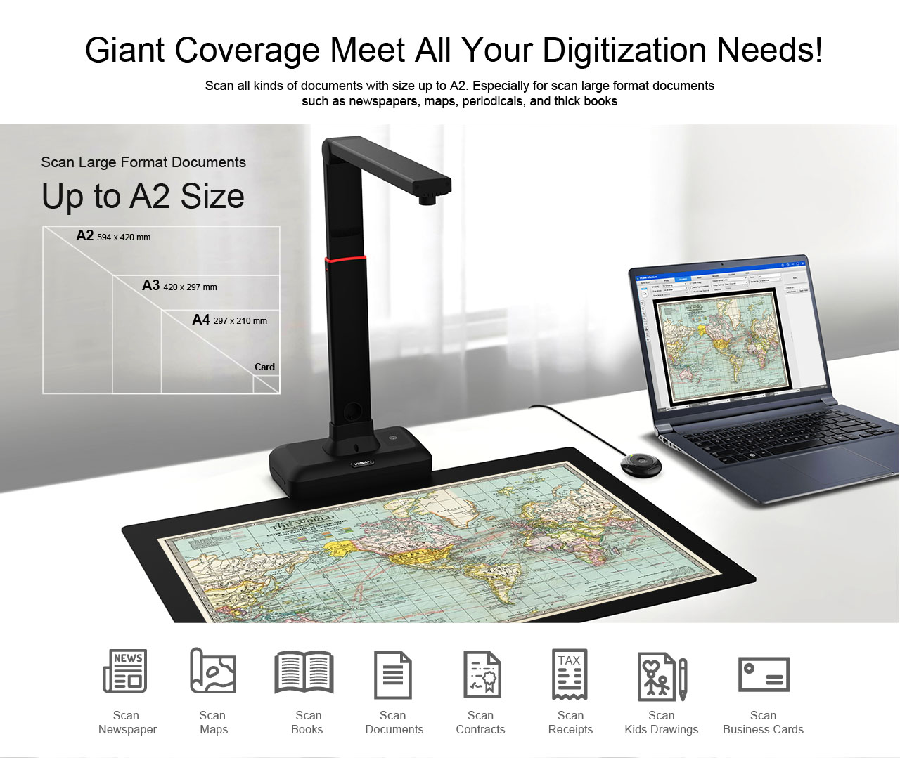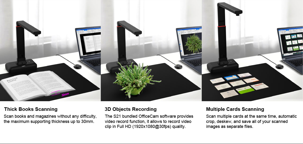 The S21 is a perfect A2 large format overhead document camera, ideal for scanning large format journals, manuscripts, newspapers, and maps. With the built-in 20.1MP high-resolution image sensor, the S21 allows taking snapshots, books, documents, business cards, 3D objects, and record videos. With the embedded OCR feature you can convert all the scanned files into PDF or editable Word/Excel/ePub/Txt files. Along with these great features, you can use the bundled VIISAN scanning software with this smart device to get great results while scanning books. For example, it can automatically digitally flattens curved pages, erases fingers from the scanned photos, repairs the damaged edges of documents, rotates pages based on text orientation, and automatically splits double-page into separate images.