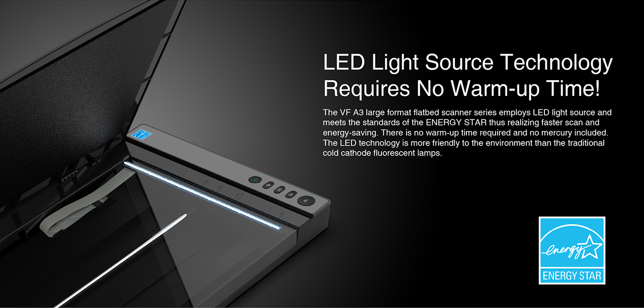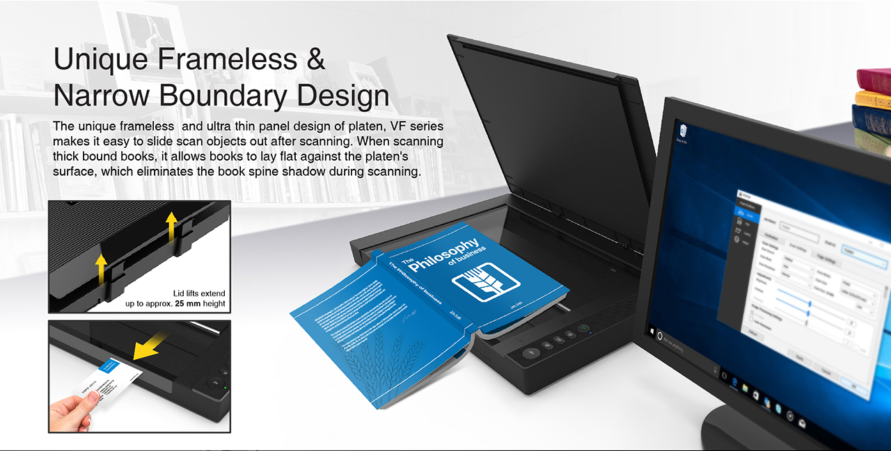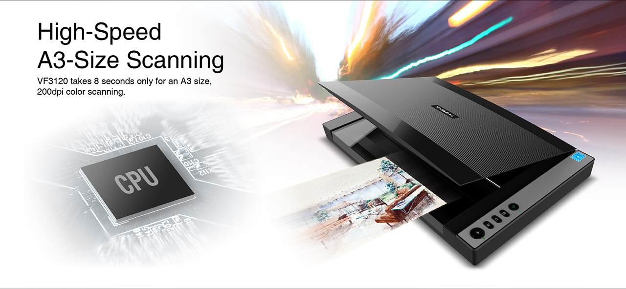 The VF3120 features in frameless and narrow boundary design which allows to scan large documents, photo albums, books, magazines, and thick items. It helps you work efficiently with four panel buttons enabling scan, email, print and even create a single or multipage PDF. All in a snap. The VF3120 offers fastest scanning speed of 8 sec (200dpi, A3-size color). It also provides a maximum optical resolution of 1200 x 1200 dpi which delivers a color depth of 48-bit vivid true-to-life image and realizes smoother and more detailed color gradient and variations.