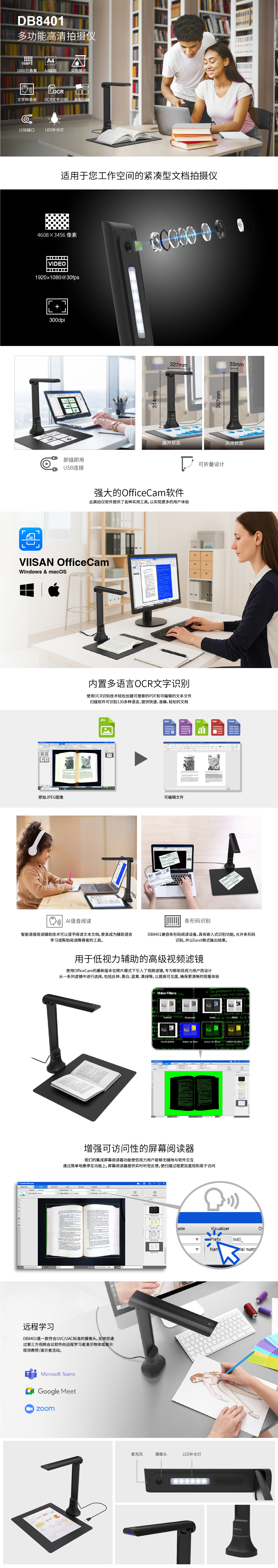 DB8401是一款紧凑型高清拍摄仪,采用可折叠相机臂设计。它经过简化,仅包含基本功能,具有高分辨率输出、交互式文档拍摄功能,并配有高效的OfficeCam软件。多种扫描工具包括桌面裁剪和纠偏技术、条形码识别、多语言OCR和AI语音阅读功能。扫描A4大小的文档,并将内容转换为可搜索的PDF和可编辑的文本格式。